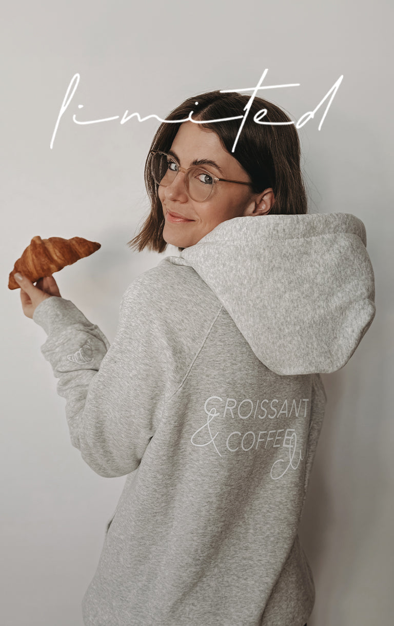 Auch unsere Hoodies finden immer wieder Platz im Leben von Sarah und ihrem Mann & es sind schon so wundervolle Fotos von unseren vergangenen Hoodies entstanden - also war schnell klar, welches zweite Produkt es werden wird. Ein Hoodie mit einem kleinen Croissant am Ärmel und einem Statement Print am Rücken: Croissant & Coffee Club! Der perfekte Hoodie für alle Frühstücksliebhaber.